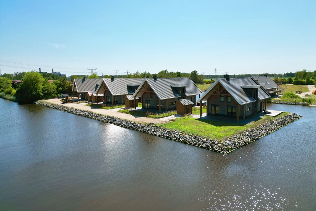 Karaktervolle recreatievilla’s aan de waterkant . Wat het eerst opvalt? De 34 watervilla’s, ruim of nog iets ruimer, hebben één ding gemeen: de karakteristieke ‘oversteek’, het ruim bemeten dak dat de huizen op een speelse manier allure en eigenzinnigheid geeft. Met wat fantasie in de stijl van een houten ‘longhouse’ in de Tropen. In combinatie met de stoere gevelafwerking een huis om meteen maar verliefd op te worden.
